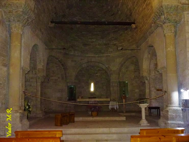 L'església, del segle XII, té planta basilical amb tres naus acabades en tres absis i un petit transsepte. La nau central està cob...